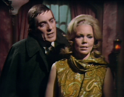 Barnabas’ next plan is less sensible. His ex-wife, wicked witch Angelique, is living nearby with her new husband. He goes to Angelique and asks her to take Carolyn in for a while. Angelique reminds Barnabas that Carolyn knows her and dislikes her. She was married to Carolyn’s uncle Roger for a while in 1968, when she was using the alias Cassandra. By the end of that period, she had alienated Carolyn and everyone else at the great house of Collinwood. Barnabas exclaims “But she won’t recognize her; you had dark hair!” Presumably the scripted line was “But she won’t recognize you; you had dark hair!”