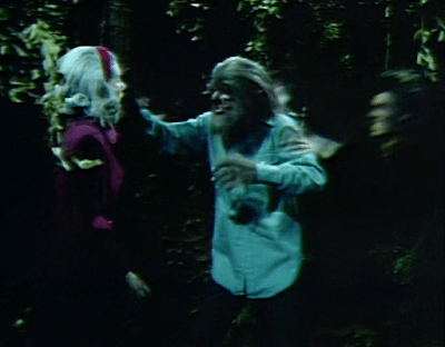 Jabe spies on Carolyn from behind the tombstone of Crazy Jenny Collins. For most of 1969, Dark Shadows was a costume drama set in 1897. Marie Wallace played Crazy Jenny then. Since the show returned to contemporary dress, Miss Wallace has been Megan Todd, fanatically devoted Leviathan cultist and foster mother to the creature now known as Jabe. They’ve had some fun depicting an erotic dimension to the relationship between Megan and the creature; Jabe clings to the tombstone suggestively, echoing this hint of Oedipal tension.