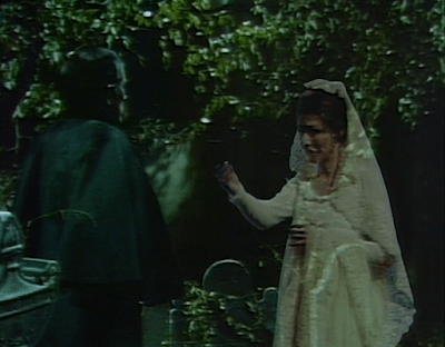 Quentin Collins enters. Amy is terrified. Starting in December 1968, Quentin’s ghost haunted Collinwood. By March, the house was uninhabitable and strange and troubled boy David Collins was near death. Old world gentleman Barnabas Collins tried some mumbo-jumbo in hopes of communicating with Quentin; he came unstuck in time and found himself in the year 1897, where he remained for eight months. While Barnabas was flailing about in the late Victorian era, time continued to pass in 1969, and Quentin’s obsession of David finally killed him in September. But a sequence of events with which Barnabas had a tenuous connection changed the circumstances on the night in September 1897 when Quentin originally died, causing him to survive. That night, as it happened, was exactly 72 years before David’s death. On Dark Shadows, anniversaries have the power that laws of nature have in our world, so that caused the haunting to break and David to come back to life. Due to a series of spells cast on him during Barnabas’ sojourn in the past, Quentin is still alive and still apparently in his late twenties in 1970. But the haunting still happened between December 1968 and September 1969, and everyone who lived through it still remembers it.