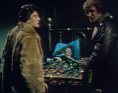 This episode also features Roger Collins, who is Liz’ brother and David’s father. Roger meets his distant cousin Quentin Collins. From December 1968 to September 1969, Quentin was a ghost who haunted Collinwood, rendering the place uninhabitable and killing David. There was a time travel story going on for most of that period, and in September 1897 events played out differently than they had the first time through. The result of that difference was that Quentin did not die. The haunting broke and David came back to life on the anniversary of the change. Some magic spells cast on him have kept Quentin alive and apparently twenty nine years old ever since, but the haunting still happened and Roger’s memory of it gives him a shock when he sees the living Quentin. He quickly composes himself; he has already heard of Quentin’s claim to be his own great-grandson, and accepts it cheerfully.