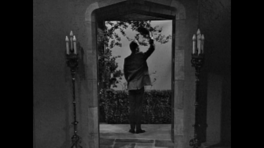 Carolyn and David are still in Burke’s hotel suite. She makes a telephone call, and comes back with news she is excited to share. Her mother Liz has told her of the coroner’s verdict. Burke, who has responded to everything else with an urbane and chipper demeanor, bursts out in rage, demanding that Carolyn take David and get out of his room. When she complies, we see him looking out his window. Seen from the outside, ex-convict Burke looks like a prisoner dolefully peering through the bars of his cell.