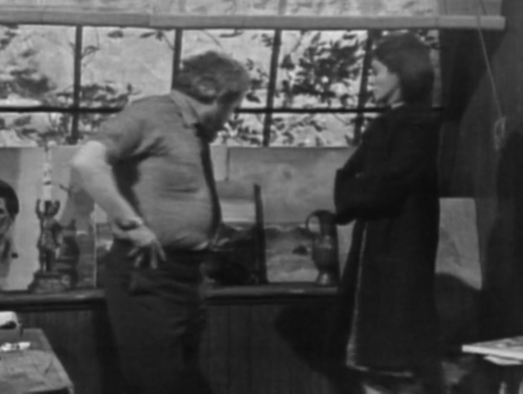 All these techniques for establishing visual dominance pay off in the scene. Sam is an artist who has so utterly despaired of finding an audience for his art that it simply does not register with him that a famous art dealer has come calling. Returning viewers will remember that Sam has been moping around feeling sorry for himself since his first appearance in episode 5. Two weeks ago, in #184, he told his daughter Maggie that it was too late for him ever to have a one-man show and that all he could ever hope for was to sell a few paintings to tourists every summer. Within minutes, Mrs Fitzsimmons has changed all of that. She watches Sam’s reactions as she turns his life upside down, and visibly calculates the particular sort of flourish with which she will deliver each of her lines. When he tells her that he thinks he will be able to assemble enough paintings within a week, she stands in the doorway and replies that she is sure he will be able to do it then, “if you can do it at all.” She then pirouettes away and wafts off whence she came.