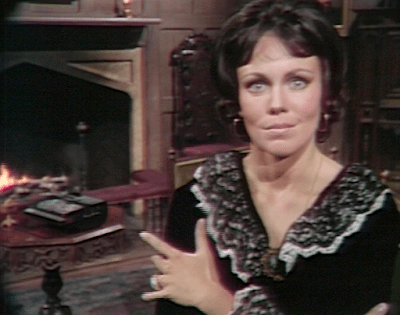 Angelique came from the 1790s to 1968 by some magical process that involved a portrait of her that is now on a stand in Vicki’s room. Today she uses a secret panel to let herself into the room and look at the portrait. We first saw that panel open when the show was a costume drama set in the 1790s. The room was occupied then by gracious lady Josette, and it was the vampire Barnabas who used the panel to enter. We haven’t seen the panel since, leaving it strongly associated with Barnabas in the minds of regular viewers. Angelique’s use of it today further suggests her identity with him when he is in his vampire state.