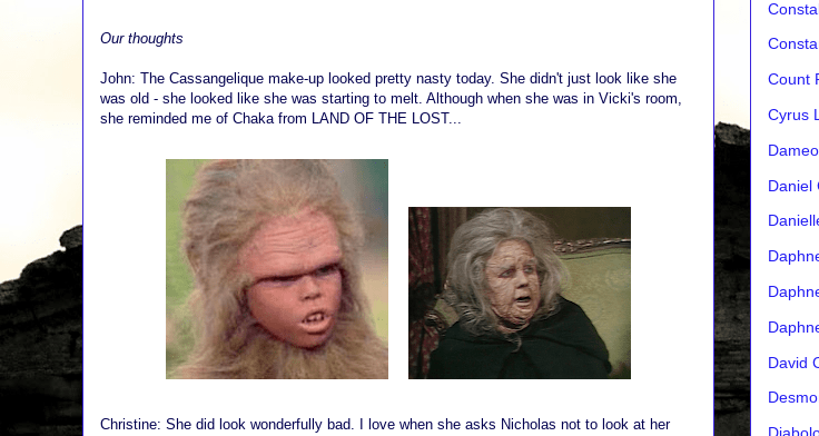 In their post about the episode on Dark Shadows Before I Die, John and Christine Scoleri find a resemblance between Angelique’s old age makeup and another TV character: