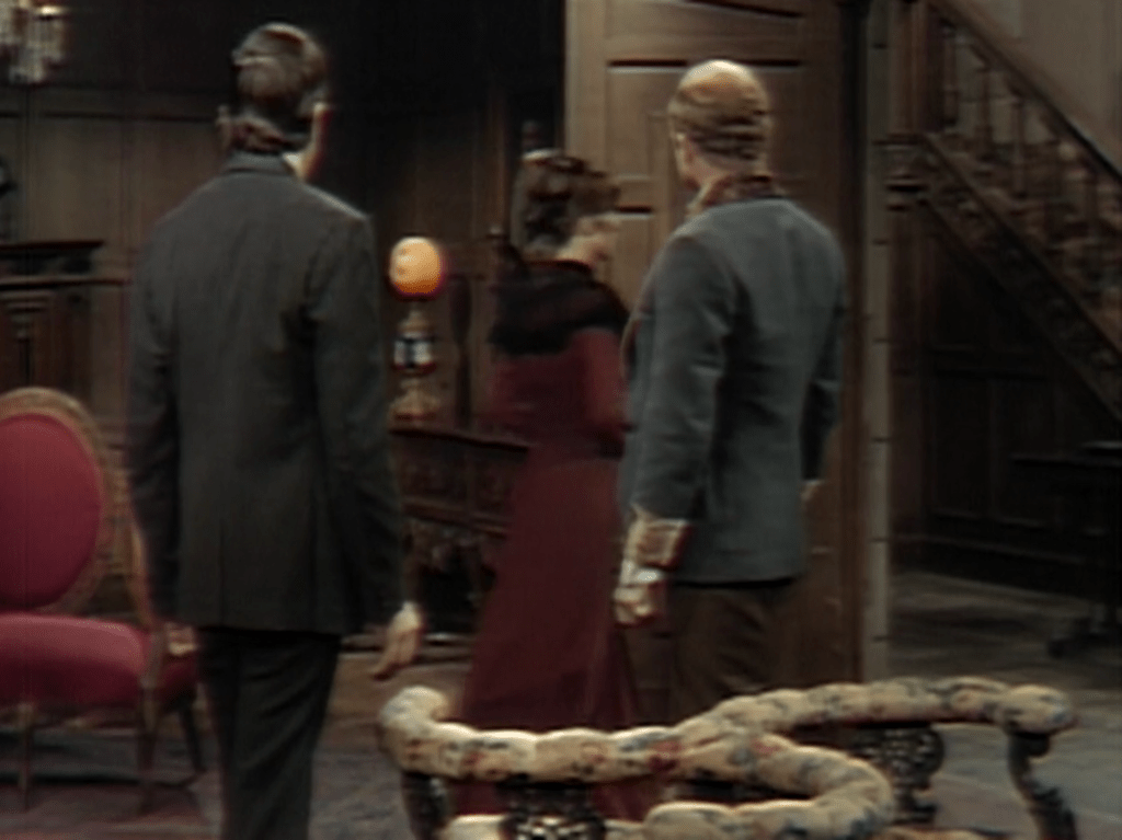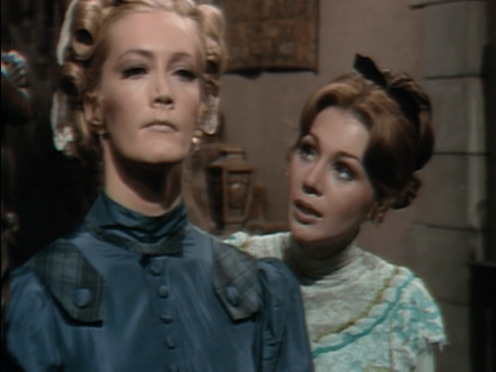 From #701, the episode in which Dark Shadows first became a costume drama set in the year 1897, they have been strongly hinting that Jenny Collins, the madwoman locked in the room on top of the tower in the great house of Collinwood, is the estranged wife of stuffy Edward Collins. Today, Jenny gets loose, and confronts Edward’s brother, rakish Quentin. It is only then that we learn that she is in fact Quentin’s wife. All of the clues that had led us to the other conclusion take on new meanings in that moment, making it one of the most effective twists on the show.