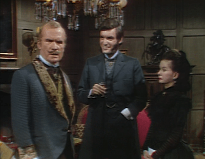 A servant named Dirk Wilkins figures in the episode a couple of times. He finds Nora outside, picks her up, and with considerable roughness carries her into the house. Perhaps this roughness is only apparent, but actor Roger Davis was notorious for physically abusing his scene-mates on camera, especially women and children. He may well have been even harder on Denise Nickerson than Dirk is on Nora.