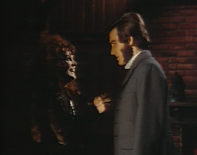 Barnabas calls for Angelique and she appears. Barnabas denounces Angelique’s crimes; Angelique brings up his. She asks what he sees when he looks in the mirror, then remembers that he casts no reflection. Angelique does not mention what we have seen ever since we first met her during the 1790s segment, that the vampire curse made Barnabas into her reflection. Today, for example, she gleefully taunts him with the murders he has committed, including those her curse compelled him to commit. This reminds longtime viewers of #341, when Barnabas pressured his friend Julia Hoffman into helping him kill a man named Dave Woodard and then gleefully taunted her with her new status as a murderer.