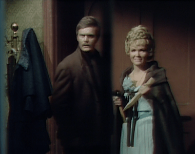 Undead blonde fire witch Laura Murdoch Collins realizes that Barnabas Collins is a vampire, and that when he was alive he was the “strange, dreamy boy with sad eyes” she was fond of in the 1760s, when she was married to his uncle. Laura and Barnabas confront each other in a graveyard at the beginning of the episode; she tells him he is not human. He passes up the opportunity to reply “So few people are, these days.” At the end of the episode, Laura and her witless henchman Dirk let themselves into Barnabas’ house after dawn. She has a mallet and stake, he has a pistol to ensure no one interferes.