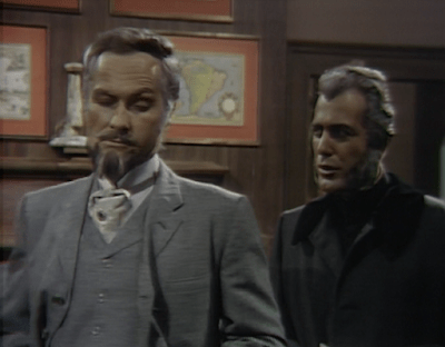 Angelique herself has come to 1897 to plague Barnabas. Laura was present at the great estate of Collinwood in that year as well. Last week was devoted to a battle between Angelique and Laura, representing a contest between two versions of Dark Shadows. It was a foregone conclusion that Angelique would win that battle- no one believes we are going back to the sedate, atmospheric, tantalizingly spooky show that ran early in 1967. But the two women were far more compelling adversaries than were any two men who have squared off against each other on the show. If you put Satan on stage, you can’t very well top him with a bigger Big Bad, so once we see that the figure in the French windows is male, we can’t really believe that Evan and Quentin’s visitor is the one they have invited.
