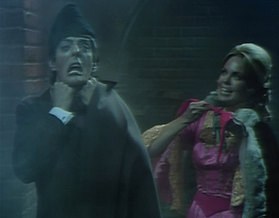 The younger man is known to returning viewers as a knife-wielding criminal named Aristide, the older as his master, who calls himself Victor Fenn Gibbon. The two urgently discuss a woman named Angelique. Fenn Gibbon tells Aristide that he can almost forgive him for being so distracted by Angelique’s beauty that he allowed her to take “the Hand” from him, and furthermore that she appears to have magical powers. He says that he showed forged papers to one Edward Collins, and that on the basis of those papers Edward concluded that he was “a member of the British aristocracy” and invited him to stay at the great house on the estate of Collinwood. Aristide will have to stay in the village of Collinsport, since Fenn Gibbon does not want their association to become known to the Collinses. Aristide is bitterly disappointed.