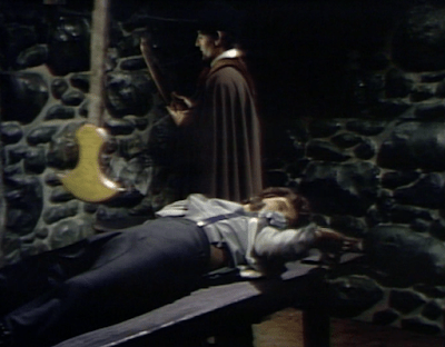 Quentin Collins is strapped to a table under a descending pendulum which supposedly has a razor sharp blade. His captor, a strange man named Aristede, tells wicked witch Angelique that Quentin will die in minutes unless she gives him the severed hand of Count Petofi, which has magical properties. Aristede is under the impression that Quentin and Angelique are engaged, and he has set the blade to strike Quentin’s body at a point causing the maximum wedding night-related inconvenience.