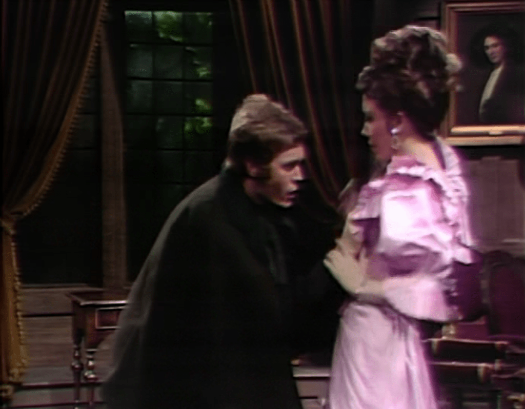 There are also a couple of scenes featuring the repulsive Roger Davis as artist Charles Delaware Tate. Mr Davis is especially hard to take in a scene with Donna McKechnie as the mysterious Amanda Harris. Miss McKechnie had already done outstanding work on Broadway as a singer and dancer by this time, but she felt herself to be a beginner as an actress, and she could not conceal her discomfort when Mr Davis shouted his lines. The 4:3 aspect ratio of old-time American television meant that the performers spent much of their time only a few inches from each other, and when Mr Davis yells in Miss McKechnie’s ear, she winces. He clutches at her arm, and she recoils; before she can relax from that invasion of her space, he slams down on a table, making a loud noise and causing her to jump.