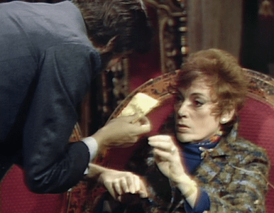 Julia declares that there is only one explanation for this phenomenon that makes sense. Considering the kinds of stories that play out on Dark Shadows, we would think that an explanation that makes sense would be the one we could discard immediately, but Julia plows ahead. When she traveled back in time, only her “astral body” made the trip. Her physical body is still in 1969. For his part, Barnabas had a body in 1897, trapped in a sealed coffin. That body is hosting his personality, which is why he is subject to physical injury. But Julia is in no danger. When she later says that she can disregard Petofi’s threats, Barnabas says that if he finds out the truth, Petofi will just find another way to immobilize her, so she has to lie low.