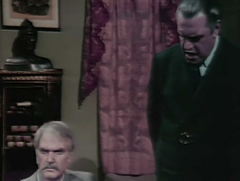 It didn’t have to be that way. Not only was Pennock a fine actor when he had something to work with, but in this episode we have a scene between Julia and rakish libertine Quentin Collins that shows how a character with a bizarre backstory and a record of evil deeds can become an audience favorite. Quentin is down in the dumps because he just failed to rescue his one true love, Amanda Harris, from the realm of the dead. Julia urges him to reconnect with the Collinses of Collinwood. He asks how he can possibly explain that he is 72 years older than he looks and is now alive, even though his ghost carried out a protracted and deadly haunting of the estate. This dialogue shows that Quentin’s origins require us to believe any number of impossible things, and longtime viewers remember that he is a murderer who killed his wife in cold blood, among other unspeakable acts. But all we see in this scene are his charm and the affection that he and Julia have for each other, and we want to see more of that, as much as they can give us. With similar material, Pennock could have achieved similar results. But it is already clear that he won’t get it as Jabe.
