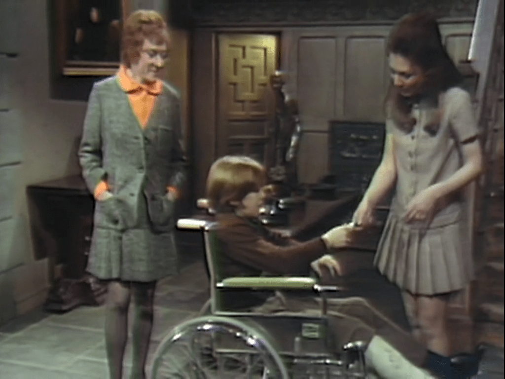The actual reason David Collins is wearing a cast and using a wheelchair is that actor David Henesy took a nasty spill on the ice. And since Jabe’s untrammeled violence is the big menace on the show right now, it makes sense that they would have him be at fault. It certainly makes more sense than does the fact that the family insists on David climbing the stairs to his bedroom with crutches, when they have a whole disused wing of servants’ bedrooms on the first floor in any one of which he could stay while he recuperates. On the other hand, that insistence does produce a moment of real hilarity. The instant David begins his ascent, governess Maggie Evans (Kathryn Leigh Scott) and permanent houseguest Julia Hoffman start talking as if he weren’t there. He must be lumbering up the stairs a couple of feet from them the whole time they are carrying on this conversation.
