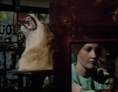 Meanwhile, Carolyn is spending the day working as an assistant in an antique shop owned by her friends Megan and Philip Todd. Our first view of the shop today features Carolyn reflected in a mirror, but the main part of it is the taxidermied head of a baying wolf, emphasizing the danger Chris poses to everyone in and around the village of Collinsport.