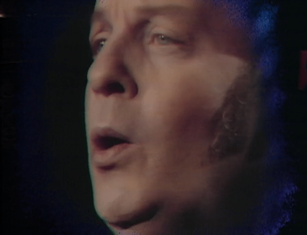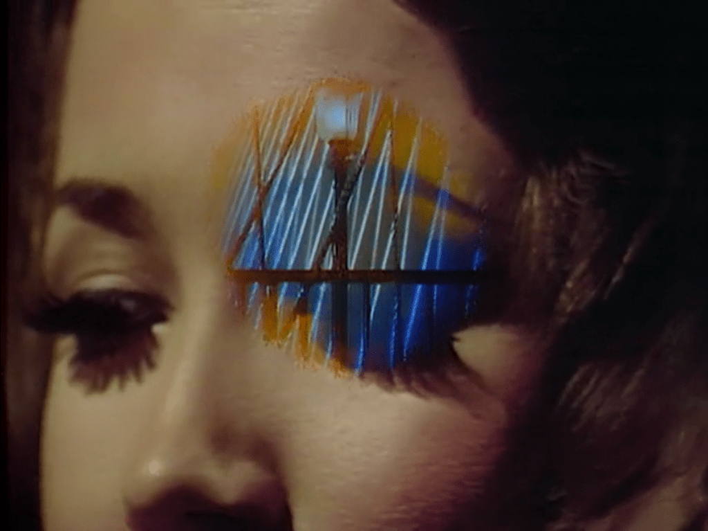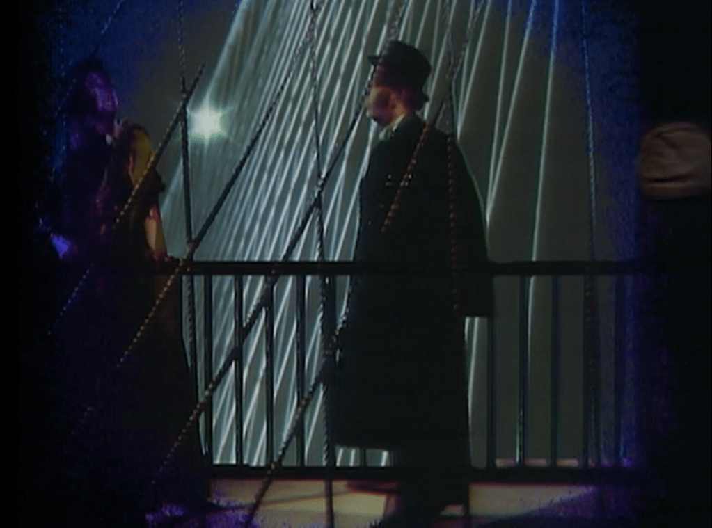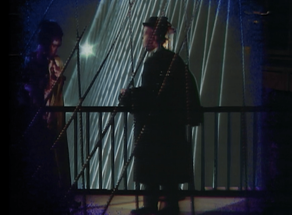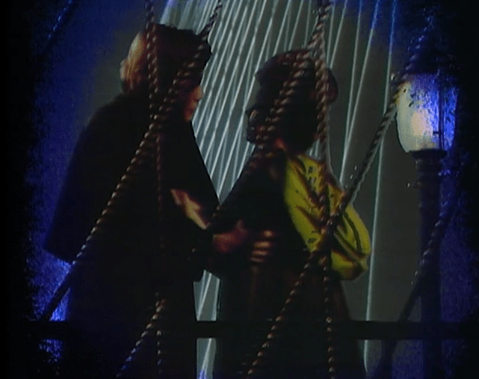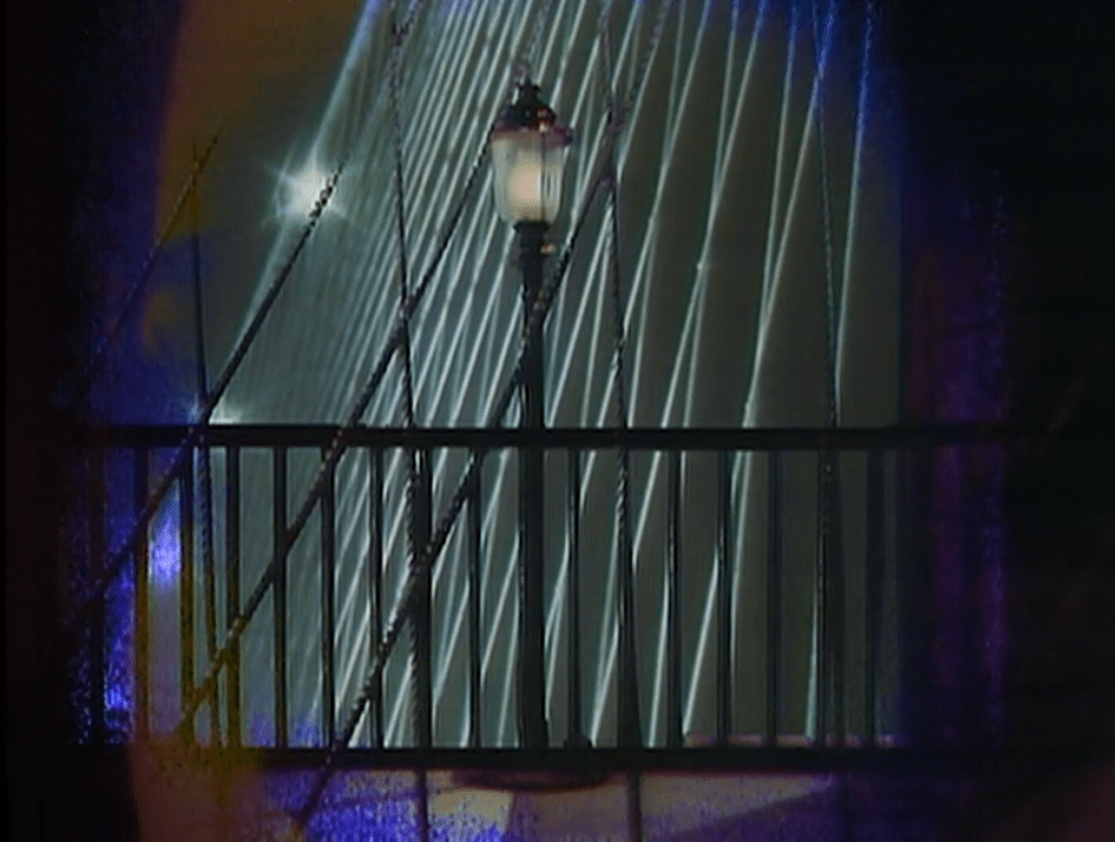 When Amanda gets to the meat of her story, we zoom in on her face for an extreme closeup. An iris wipe starts from her left eyelid, growing into a stage set representing a bridge in New York City. She and Quentin have a conversation that covers the same ground as the one we saw in #884, and he leaves her alone on the bridge.
