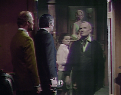 Probably the most memorable shot in the episode is a very impressive bit of videotape editing. Roger and Barnabas are standing at the door to the Parallel Time room, watching Roger’s counterpart interact with Liz’ and Chris’. Parallel Roger walks toward the door. He exits the room, not into the space Roger and Barnabas occupy, but into the hallway as it exists in Parallel Time. He vanishes from their view, and the effect also winks out in the room, leaving Roger and Barnabas looking into the bare, dark chamber it is in the house they know.