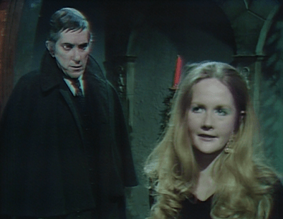What we had seen of “Parallel Time” before Barnabas arrived let us know that Quentin was bringing a new bride home, much to the displeasure of Hoffman and Angelique’s other acolytes. We also knew about the Loomises. So that left us with two candidates to play the part of the intimidated, anxiety ridden “second Mrs de Winter.” Those were Kathryn Leigh Scott, who has been Maggie in the main continuity since episode #1 and has played other parts in time travel segments and as a ghost, and Lisa Blake Richards, who plays Sabrina Stuart, girlfriend of werewolf Chris Jennings.