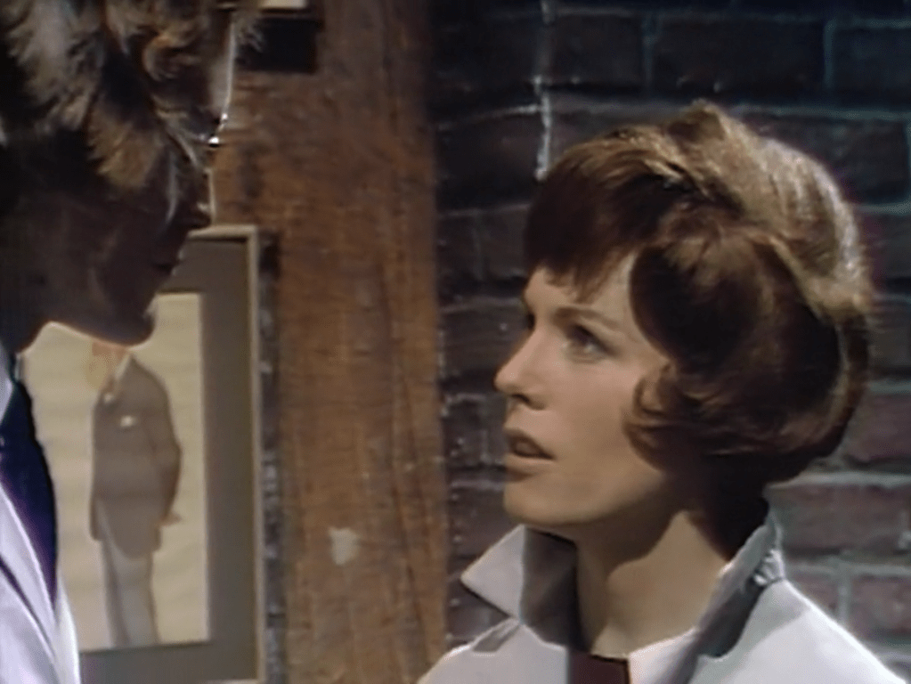 This scene gives Miss Richards more to work with than she had had in her whole time in the main continuity. The look Sabrina gives at the end of Cyrus’ gust of lunacy is the first time she has had a chance to get a laugh, and she makes the most of it. As for Christopher Pennock, he had just been getting the hang of his previous part, hugely overgrown infant Jeb Hawkes, when he was written out. With Cyrus, he can to some extent pick up where he left off. Pennock had begun to find a way to suggest that there was a real sweetness bottled up inside one-man wrecking crew Jeb, and in Cyrus’ love for Sabrina he can play a character who is Jeb’s mirror image- abundantly sweet, but so deep inside his own head that he is about to become a monster.
