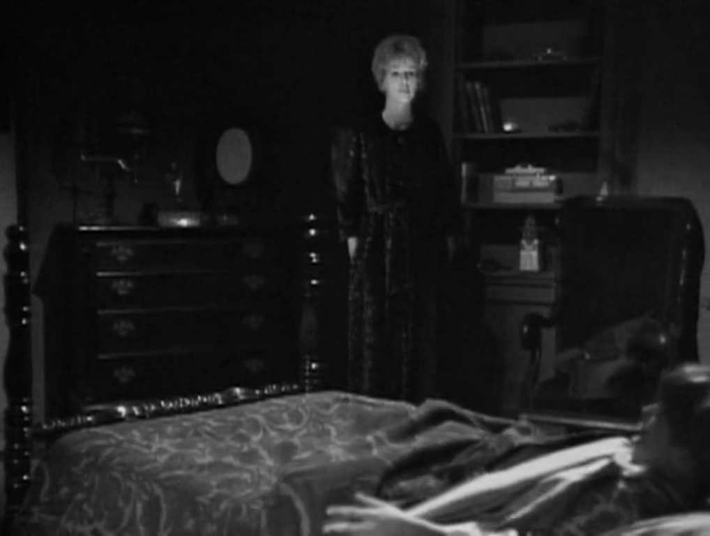 Now, we have crossed over into an alternate universe, which the show insists on calling “Parallel Time.” David’s counterpart is strange and troubled teenager Daniel Collins. Daniel is unwilling to believe that a woman who has come to the estate of Collinwood is not his late mother, Angelique Stokes Collins. We see him asleep in his bedroom. As Daniel’s problem is the mirror image of David’s, so his room is the mirror image of David’s. Daniel’s bed is at stage right while David’s is at stage left on the same set. Daniel has a troubling dream in which Angelique appears to him. Dark Shadows is a lot more definite now than it was in its first year, so they have a special effect to show that even though Daniel is opening his eyes and getting out of bed, it is still a dream sequence. It is 1970, so that special effect is a disco glitter ball throwing colored lights.