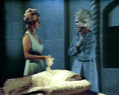 Angelique and Alexis stand facing each other in the tomb. Angelique explains that all she needed to come back to life was a touch. Now that Alexis has given her that, the warmth has begun to drain from her body into Angelique’s. Soon all of Alexis’ body heat will be transferred to Angelique. She will then die, and Angelique will trade places with her. The “heat vampire” idea was one the show explored briefly in April 1969, when undead blonde fire witch Laura Murdoch Collins drained the warmth from the bodies of the living to keep herself alive. Now Angelique will return from the grave as another heat vampire. Alexis will lie in the coffin, and Angelique will move back in to the great house of Collinwood, where Alexis has for the last three weeks been staying as Quentin’s guest.