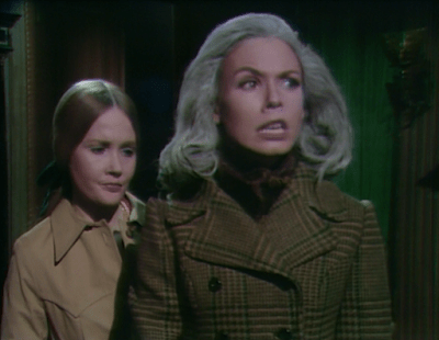 One of Chris’ surviving victims is his ex-fiancée, Sabrina Stuart. Sabrina saw him transform, and as a result was struck dumb for years and went prematurely gray. She can talk now, but she’s still gray. She shows up today at the great house of Collinwood where she calls on heiress Carolyn Collins Stoddard. Carolyn tells Sabrina that she doesn’t love Chris and never will, but that she realizes Sabrina loves him. This adds to a growing list of reasons the show has given us to doubt that Chris will be on much longer. His premeditated murder of Tate establishes him as a pure villain. A villain’s function is to create problems for other characters to solve, and Chris has been too passive and too dependent on Julia to be an interesting villain. His relationship with Carolyn gave him a connection to the core cast, but Carolyn’s conversation with Sabrina makes it clear that that is gone now.