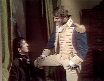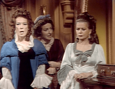 All of the acting is excellent in this one. That’s no more than we would expect from most of the cast members we see today, but Vala Clifton’s two turns as the living Maude were pretty bad, so that it is a pleasant surprise that she is so good as Maude’s ghost. The physical space gives her a hard job. She is standing a very few feet in front of Jerry Lacy with only a couple of wispy stage decorations indicating that she is separated from him, but she strikes a pose and maintains a degree of stillness that really does create the sense that she is speaking to him from another realm. She also manages to keep up an ethereal quality while making it clear that Maude is determined to be avenged. I wonder what her first appearances would have been like if she had had more time to rehearse. If they had been as good as this one, Ms Clifton and Maude would be among the more fondly remembered parts of the eighteenth century segment.