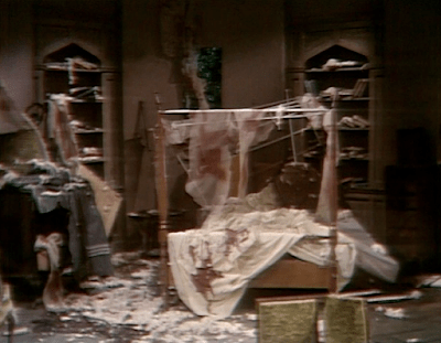 The echo of those episodes is startling coming on the heels of the scene we just saw, in which Millicent figures as a student of the countess. Julia and the countess are both played by Grayson Hall, and Millicent and Carolyn are both played by Nancy Barrett. The relationships between their characters are different now, shifted as the colored pieces shift in a turning kaleidoscope. But remembering those earlier episodes, we might remember that what is seen in a semiconscious state might be a message sent to manipulate and deceive, and we certainly remember that people who go to the Old House are in danger from Barnabas.