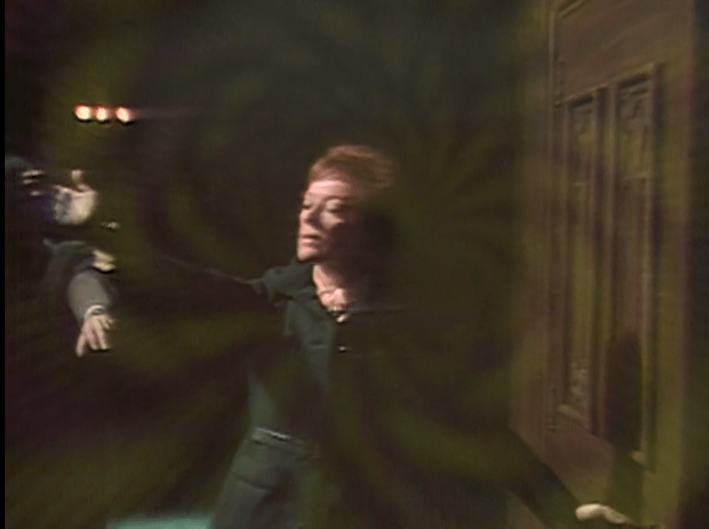 Humphrey’s style was more like pantomime or puppetry than it was like anything native to screen acting; she strikes a series of poses, and tells the story through them, producing the dialogue as a sort of incidental accompaniment. She has such a complete mastery of this approach that she could hold the audience’s interest for any length of time, regardless of what she had to do or with whom she had to do it. Unfortunately, today is her final appearance- at the end of the episode, Madame Findley falls down the stairs in the foyer of Collinwood, dead.