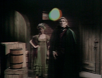 Most people nowadays who have been watching the show for some time will therefore take the strange goings-on as much in stride as Barnabas does. But viewers at the time may have had a different reaction. Friday’s episode and today’s originally ended with announcements over the closing credits. These announcements were not on the original master videotapes from which Amazon Prime Video and Tubi and the other streaming apps take their copies of the episodes, and so most viewers these days don’t hear them. But evidently one of the DVD releases reproduces them as they were preserved on some kinescopes. One promises that in Tuesday’s episode “one of the most terrifying tales ever told” will begin; the other, that it will be “one of the most unusual tales ever told.”