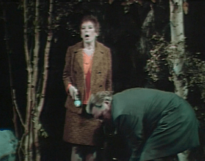 In the great house of Collinwood, Barnabas’ distant cousins Roger and Liz are at odds. Roger keeps having conversations with a portrait, in the course of which he loses track of the time. The correct time is 1968, and he keeps thinking it is 1795. When he does that, he mistakes himself for his collateral ancestor Joshua Collins and his sister Liz for Joshua’s wife Naomi. Today, Liz has to slap Roger to get him back to himself. Louis Edmonds’ alternation between Joshua and Roger is masterful, one of the outstanding moments of acting in the whole series.