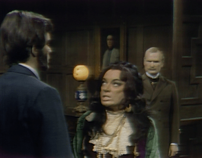 Edward is thunderstruck, and exclaims “You married a Gypsy!” Yesterday it seemed that Edward and Quentin’s sister Judith, the owner of the house, had known Jenny’s origin for some time, and that it was why she locked Jenny up in the house when she went insane rather than sending her to a mental institution where Sandor and Magda might be among her visitors. And as far back as #701, it seemed likely that Beth knew secrets relating to Jenny, to Magda, and to Romani heritage. In that episode, Quentin marveled that Beth was still around Collinwood when Jenny, who had brought her to the house as her servant, had left, and Magda taunted Beth by bringing up a bit of Romani folklore and laughing “But you wouldn’t know anything about that, would you?” So while Jenny’s background is news to Quentin and Edward, it may not be true that “None of us” knew.