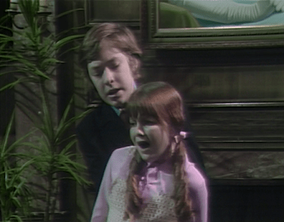 The audience could tell it wasn’t Denise Nickerson singing- she had such a high-pitched voice when she was twelve that she had to work hard to keep it in a range that would sound good on television, while the pre-recorded voice we heard singing was definitely that of a grown woman. Angelique was played by Lara Parker; Parker did some very distinctive things with her voice on Dark Shadows, none of which shows up in the lullaby, so I’m sure it wasn’t her. Several fansites attribute the singing to Joan Bennett, who is in this episode, but I’ve heard Bennett sing and she didn’t get from one note to another the way this voice does. I think the singer must be Kathryn Leigh Scott.
