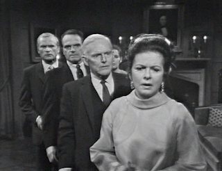 We then cut to the study in great house of Collinwood, where high-born ne’er-do-well Roger Collins has to confront his sister, reclusive matriarch Liz. The auditors have told Roger that the books are out of balance at the family business. Roger knows that the reason for this is that Liz is giving money to buy the silence of seagoing con man Jason McGuire. He reminds Liz that he himself was afraid of blackmail for the first 40 weeks of the show, so he knows from personal experience that it is no way to live. Liz refuses Roger’s plea that she tell him her secret. As he probes and she resists, they move around the room at times like fencers, at times like dancers performing a paso doble. Their movements are easily the most interesting element of the episode, a credit to director John Sedwick.