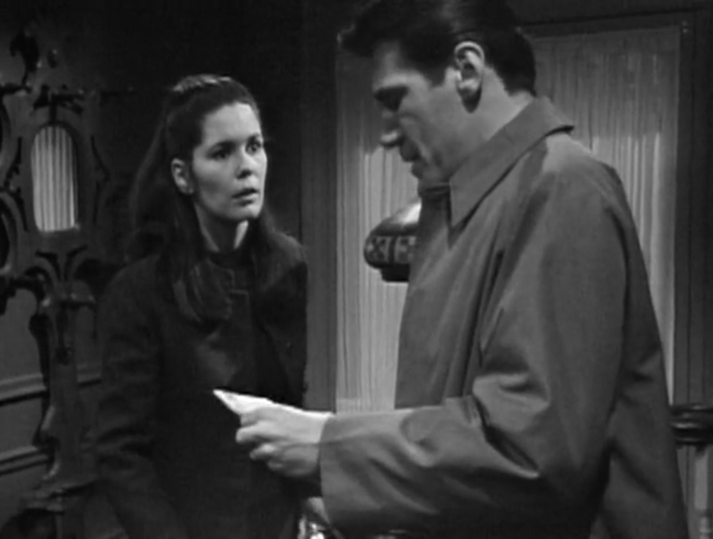 By the end of the scene in the drawing room, first time viewers will be very largely caught up on what was going on when Vicki left in November. Before Vicki even appeared, we learned that Barnabas Collins recognized Phyllis Wick and was alarmed to see her, telling us that he is an interloper from the past trying to conceal a secret. Permanent house-guest Julia Hoffman announces that she is a medical doctor. Julia apologizes to Liz for having concealed this fact, which not only lets us know that she did conceal it but also tells us that the house belongs to Liz. Julia and Carolyn exchange frosty words, making it clear that they are enemies. Julia is even chillier to Barnabas, while Barnabas and Carolyn exchange a conspiratorial look. In contrast to all of these promises of drama, the reasonable observations Roger makes and his straightforward helpfulness suggest that he hasn’t been an active part of a storyline for some time.
