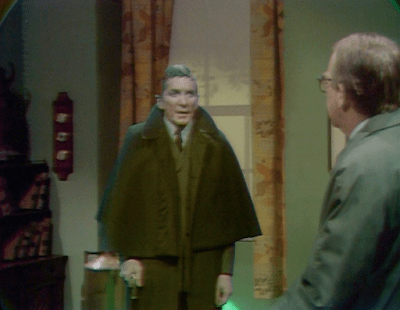 Barnabas has told Lang a great deal about himself. For example, in #467, Lang was the first person Barnabas told that his vampirism was the result of a curse placed on him by wicked witch Angelique. So returning viewers can believe that Barnabas might have confided in Lang about the murder of Dr Woodard. But it would be strange for him to have done so off-screen. And just Friday, Barnabas explained to Lang that the reason he thinks Julia can be trusted with the secret of the experiment is that she has a crush on him.* He hasn’t had much time to share more information with Lang since then, and if Lang had already known that Julia couldn’t call the cops without exposing herself to a murder charge Barnabas wouldn’t have needed to mention her crush on him. The likeliest explanation is that the loud and clear exclamation of “Dave Woodard!” is not Lang prompting Barnabas at all; rather, it was Addison Powell prompting Jonathan Frid. The result is a blooper that seriously confuses the relationships among Lang, Barnabas, and Julia. It’s early enough in the episode that it really is odd they didn’t stop tape and start over.