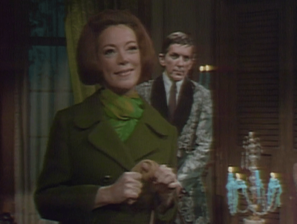 On the terrace of the great house of Collinwood, Barnabas and Julia talk about Lang’s experiment. Angelique, wearing a black wig and calling herself Cassandra, lives in the house as the wife of sarcastic dandy Roger, and the terrace is surrounded by trees, fences, and other prime screens for eavesdroppers. Barnabas and Julia know this well, as each of them has eavesdropped on important conversations here themselves.