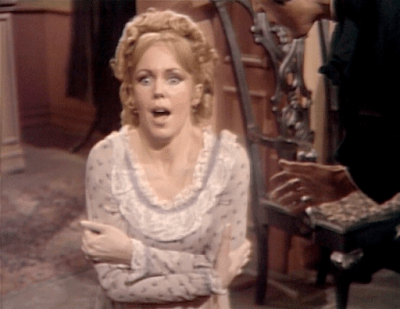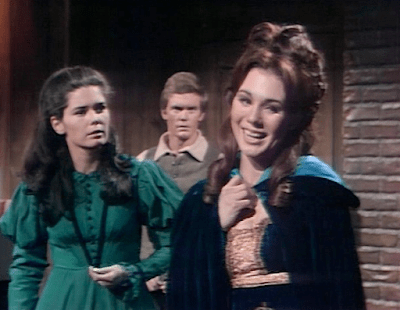 As it happens, Vicki has had extensive experience with ghosts, most of it quite friendly. During her first captivity, when strange and troubled boy David trapped her in a room in the west wing of the great house of Collinwood, the ghost of local man Bill Malloy appeared to her, sang, and dripped seaweed on the floor. That frightened her at the time, but led to the breakthrough that ended David’s hostility to her. During her third captivity, when crazed handyman Matthew Morgan kept her in a secret room in the Old House on the same estate, the ghost of gracious lady Josette appeared to Vicki, told her not to be afraid, and led other ghosts, including Bill’s, in scaring Matthew to death before he could kill her. Vicki and Josette’s ghost teamed up to lead the opposition to David’s mother, undead fire witch Laura Murdoch Collins, when she came back to Collinwood and tried to lure David to his death. So Angelique might be missing a chance to ingratiate herself to Vicki when she shows her that she is not a ghost.