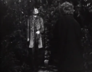 The simulacrum first shows up in a transparent form in Judith’s bedroom. Judith screams. In the drawing room, Trask and Edward hear her scream and break off a conversation in which Edward has been urging Trask to agree to annul his marriage to the obviously disturbed Judith. Judith comes downstairs. She is reluctant to explain why she screamed, and tells Edward and Trask that nothing is wrong. She and Trask go to the drawing room and talk privately. He has to prod her a bit before she will admit she saw Minerva. He tells her it was just her imagination. She considers this; after all, she was in bed when she saw the image, so it may have been a dream. But then the simulacrum appears in the drawing room, near the spot where she saw Minerva’s ghost on her wedding day. Judith sees Minerva sitting quietly and sewing. Trask pretends he does not see anything; after a bit, Judith pretends she can’t see the image either. Trask leaves Judith alone with the simulacrum. Judith goes upstairs, and the simulacrum follows her. When they reach the top of the staircase, Judith cries out in fear and tells the simulacrum to stay away from her.
