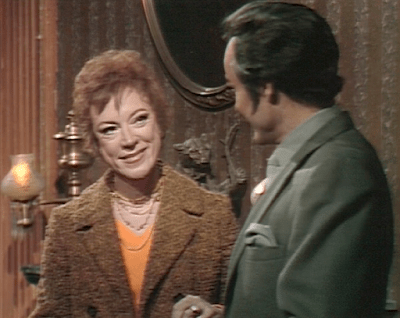Later in the episode, Barnabas wakes up and is distressed to find that it is almost sunset. He pleads with Vicki to bring him a cross as quickly as possible. The audience knows, but Vicki does not, that Barnabas is the victim of vampire Angelique. Vicki’s ignorance of this point reminds us that she has been excluded from the show’s A-plots ever since #211, when Barnabas was introduced, himself in those days a vampire. Her calm departure to go fetch a cross reminds us that she knows this part of the house well. Every room in it is stuffed with bric-a-brac, undoubtedly she will have seen something nearby that is in the shape of a cross.