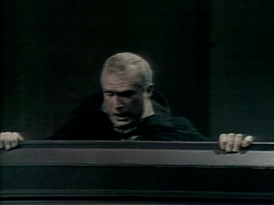 Carolyn goes back to her mother’s crypt and is attacked by a werewolf. Liz knew she would be buried alive, and so insisted her coffin be equipped with a button that would ring bells everyone at Collinwood could hear. While Carolyn is confronting the werewolf, Liz overcomes her paralysis sufficiently to push this button. That brings Barnabas and Julia.