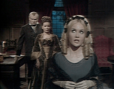 The other line marks Naomi as a remarkably advanced feminist for her time and place. She says that Abigail was “Like a businesswoman with no business to run.” The concept of “businesswoman” was hardly familiar in the days when this episode is set. Even the word “businessman” was not widely known then- the earliest citation of it in The Oxford English Dictionary dates to 1798, two years after this episode is supposed to be taking place, and its first appearance in the modern sense came several years after that. The same dictionary can find no use of “business-woman” until 1827, and then in only a strongly pejorative sense. But the audience, seeing Joan Bennett on this set, will think of her character matriarch Elizabeth Collins Stoddard, who in the parts of Dark Shadows set in the 1960s runs the family’s business enterprises from this room. Naomi is looking towards the future, and she sees Liz.