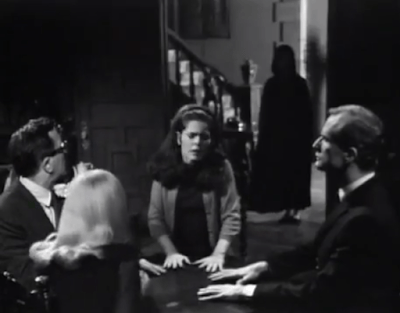 When Jeremiah’s ghost fades away, we see Timothy Gordon for the last time. Gordon was a frequent stand-in and background player starting in July 1966. His right hand, which he extends to Kitty in the screenshot above, was the hand that shot out of the coffin Willie Loomis was trying to plunder in #210. In mischievous moments, I think that makes him “Barnabas Collins #1,” in imdb terms. Then again, Jonathan Frid had posed for the face of the portrait of Barnabas some weeks before, and producer Robert Costello modeled for the portrait’s body before that. Many of his fellow extras went on to big careers, but Gordon’s turn as Jeremiah’s ghost made him the only performer to graduate from background player to credited member of the main cast of Dark Shadows. So I think of him as their representative.