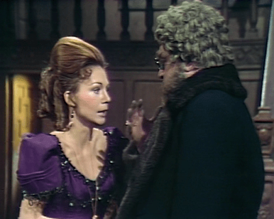 Ever since its first time-travel storyline, when it spent November 1967 through March 1969 visiting the 1790s, Dark Shadows has been committed to treating its cast as a repertory theater company. Now, we are coming to the end of the 35th week of an arc set in 1897, and most of the actors are not only playing characters unique to that year but are playing two characters at once. So David Selby joined the cast as rakish libertine Quentin Collins, and Thayer David, who has played several parts on the show, had been playing sorcerer Count Petofi. But a few weeks ago Petofi cast a spell to trade bodies with Quentin. I refer to the villainous Petofi who looks like Quentin as Q-Petofi and to the forlorn Quentin who looks like Petofi as P-Quentin.