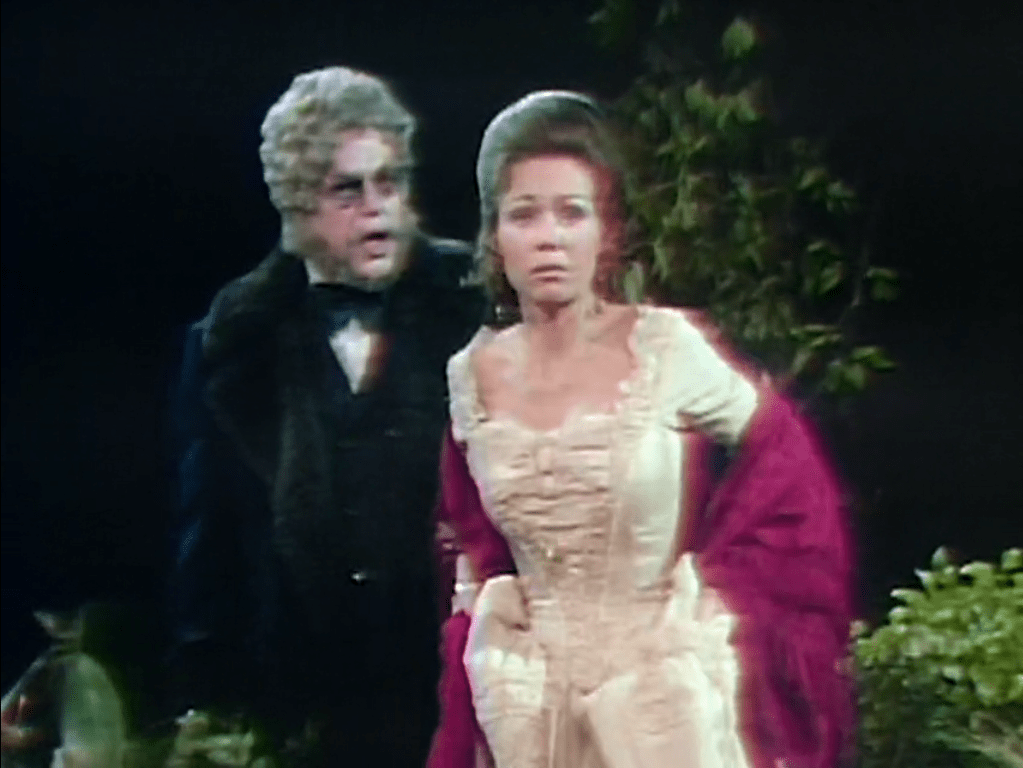 Pansy has a dream in which she and Quentin dance in the drawing room of Collinwood while a specially recorded version of her song, I Wanna Dance for You, featuring the voices of Nancy Barrett and David Selby, plays in the background. Colors flare on the screen while we hear them sing. Miss Barrett was an excellent singer, Mr Selby an adequate one. He does speak a few of his lines, which damages the rhythm of the song, and the flaring colors often obscure the actors completely. Mr Selby and Miss Barrett are so lovable that we very much want to overlook these flaws in the number’s conception.
