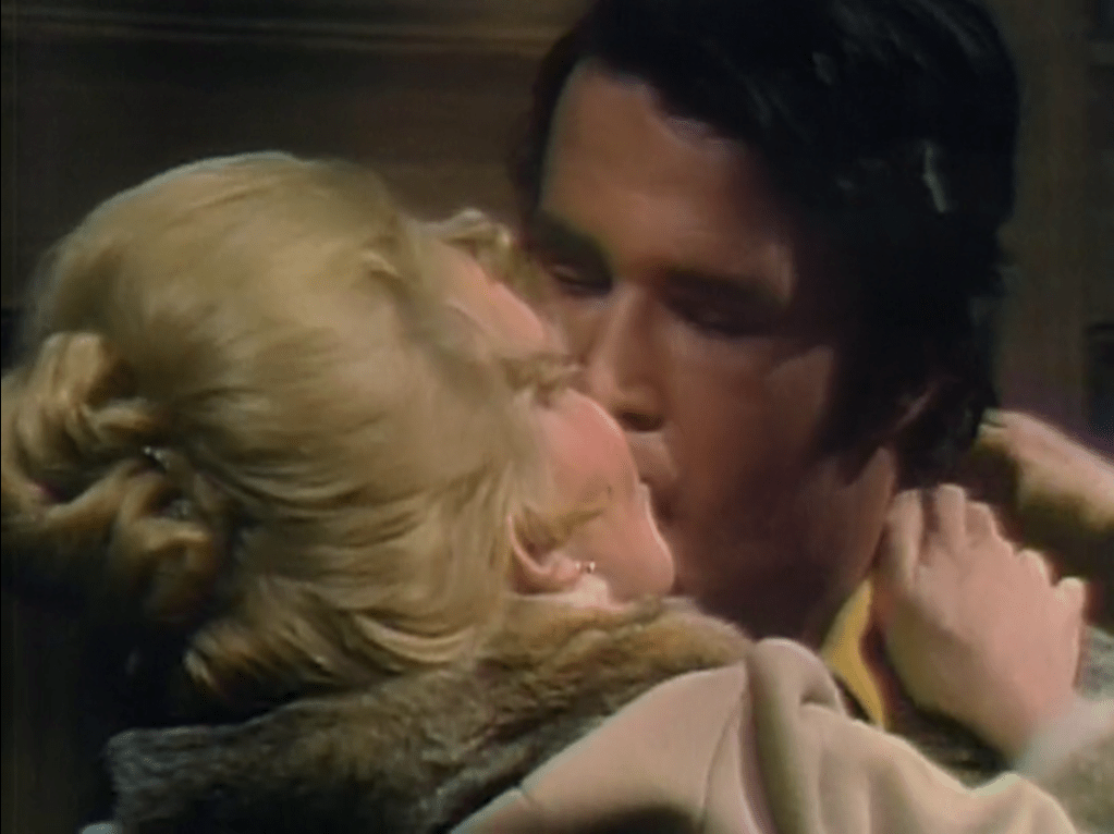 The second scene ends with a more successful kiss. It is accompanied by a woodwind piece that used to be associated strongly with well-meaning governess Vicki and her doomed love for dashing action hero Burke Devlin. Burke was written out of the show in 1967, Vicki in 1968, and this music cropped up occasionally in 1969 during sentimental moments. It is still noticeably more old-fashioned than the rest of the score, albeit more dynamic than the string serenade that went along with the first kiss.