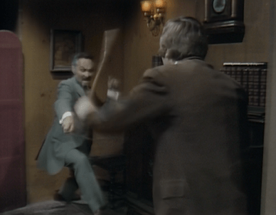 Quentin knocks Evan out with a candlestick; the background music is a cue we have previously heard during on-camera murders, leading us to wonder if Evan will survive the blow. Quentin rummages around for a moment and finds the hand. He is looking at it, wondering how to use it to restore his appearance, when a man in a wool cap enters and orders him to surrender the hand at once.