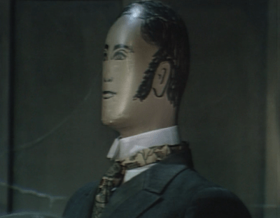 Before we see Maggie and Barnabas, we are treated to a closeup of the tailor’s dummy to whom David referred in #681 as “Mr Juggins.” The camera pulls back, and we see that Mr Juggins is standing in front of a stone bust and next to a globe. The effect is quite stately. Unfortunately, this is Mr Juggins’ final appearance on the show. I think he had a lot of potential.