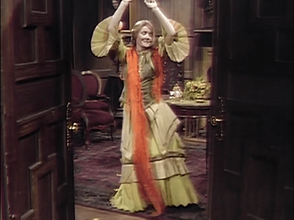 The musical number is preceded by Pansy making what literary critics call a programmatic statement. “Feel like it or not, you gotta do it, the show must go on. That’s the one and only rule there is, love. So let’s have a bright chorus from that new team, Pansy Faye and Quentin Collins.” Pansy is not only a good pal and a gifted psychic, she is an accomplished scientist. She has indeed stated the complete physics, metaphysics, and every other operating principle of the universe of Dark Shadows when she says that “The show must go on.”